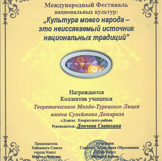 В лицее Д. Кантемира г. Кагул, 9 апреля состоялся фестиваль национальных культур, наш лицей также принял участие. На этом фестивале учащиеся ТМТЛ им. С. Демиреля с. Конгаз показали турецкий и гагаузкий народные танцы. Была очень теплая дружеская атмосфера, все участники воодушевленные и довольные вернулись домой!